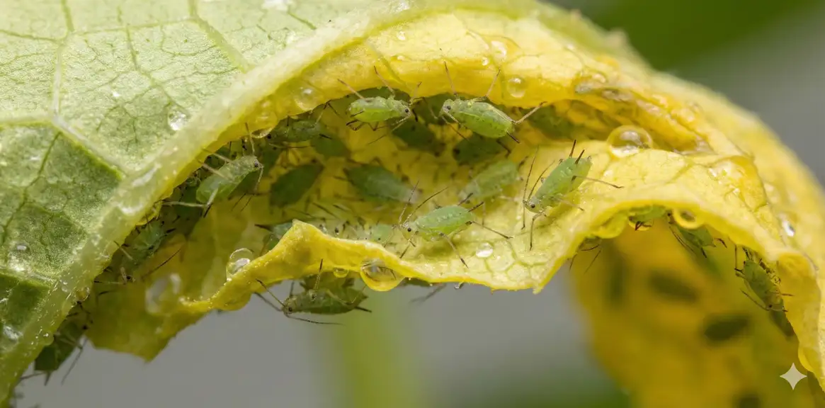 Aphids suck plant sap, weakening growth and reducing vigor. They also transmit viral diseases like mosaic virus from plant to plant. The sticky honeydew they excrete promotes sooty mold fungus growth on leaves, further reducing photosynthesis. Heavy infestations can significantly stunt plant growth and reduce fruit production.