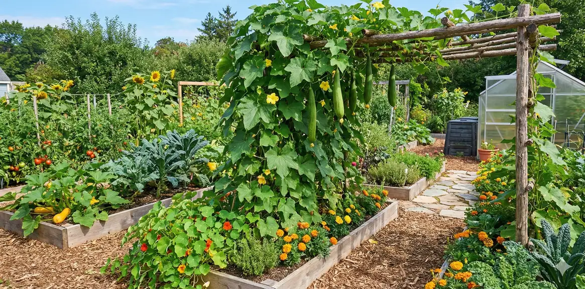 Guild planting groups mutually beneficial plants that support each other's growth, reduce pest pressure, and maximize yields from limited space. A well-designed loofah guild combines nitrogen fixers, dynamic accumulators, pest deterrents, and ground covers. Explore companion planting guilds for detailed plant combinations.